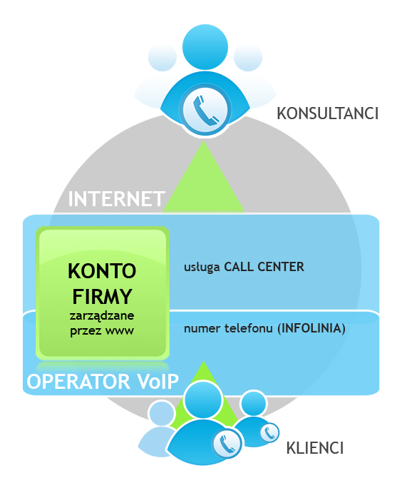 Firmowe Call Center ma na celu profesjonalną obsługę klienta poprzez kolejkowanie połączeń, w przypadku gdy wszyscy konsultanci prowadzą rozmowy. Z chwilą zakończenia rozmowy przez konsultanta łączona jest do niego automatycznie pierwsza osoba oczekująca w kolejce. Pozostałe osoby oczekujące są informowane o zmianie ich pozycji w kolejce.